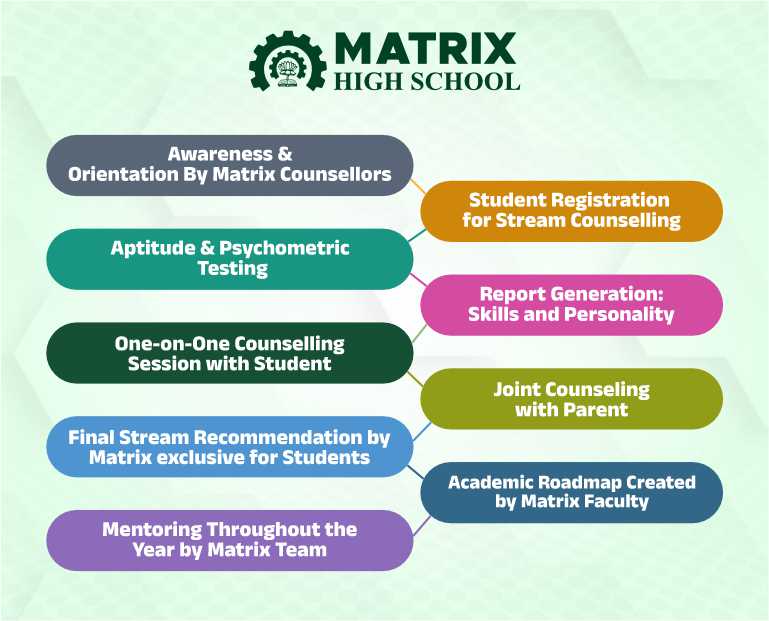 In Matrix High School, we believe that the decision to choose stream isn’t just about choosing subjects, actually it’s about recognising strengths, interests and what are career goals? Any decision taken in haste can lead to academic struggle, lack in motivation or mental stress. Nevertheless, a one on one counselling from the Matrix High School help desk can help you in sustaining the interest in the right stream, spark curiosity and even act as Launchpad in fulfilling career goals.