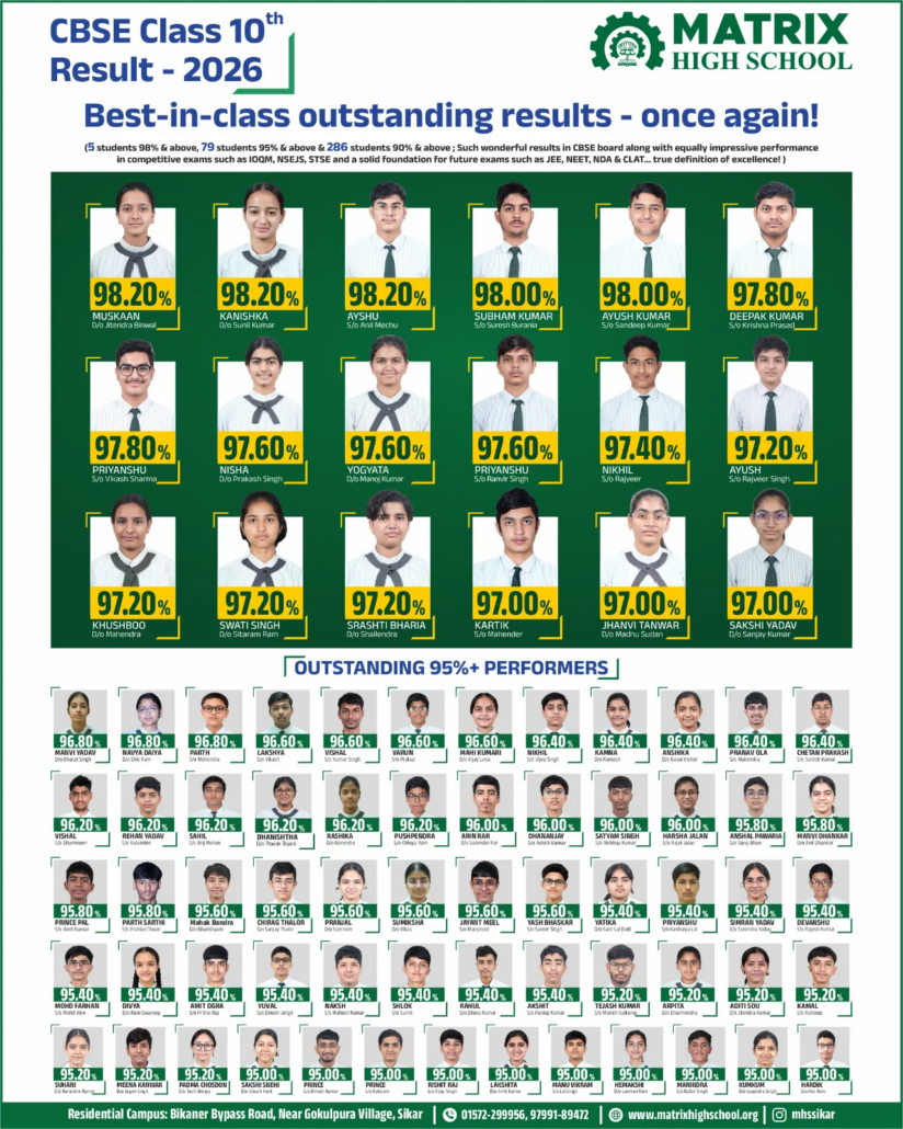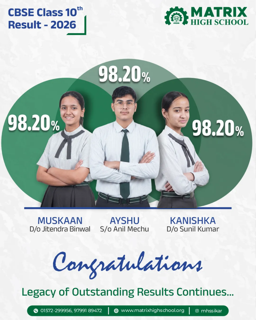 - In 2026, three students stood as top performers of the Sikar district from Matrix High School – Muskan Binwal, Ayshu, and Kanishka, with a score of 98.20%. With a batch size of 949 students, the average board score was observed to be 82.63%, which is a never-before-seen result in Sikar.